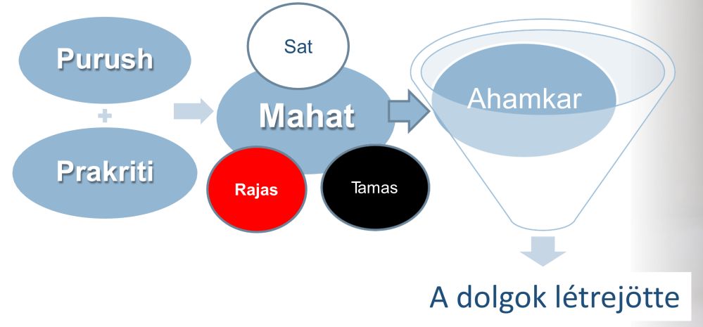 (*2) A fordító megjegyzése: Az alábbi séma mutatja a dolgok létrejöttének menetét a számkja filozófia tanítása szerint. A spirituáis fejlődés során ugyanezen az úton lehet visszatérni (a nyilak megfordításával) a durva anyagtól a Purusáig.